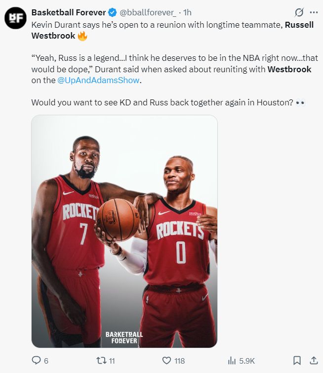 北京時間10月9日,火箭球星凱文-杜蘭特在接受UpAndAdamsShow訪問時談到了關(guān)于拉塞爾-威斯布魯克與火箭的流言情況,KD表態(tài)愿意跟威少重聚。